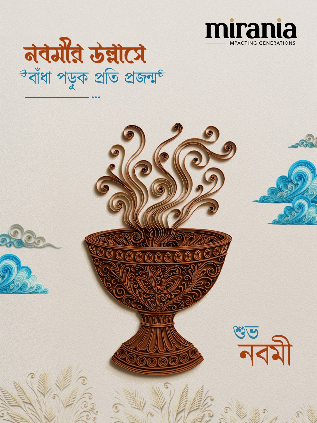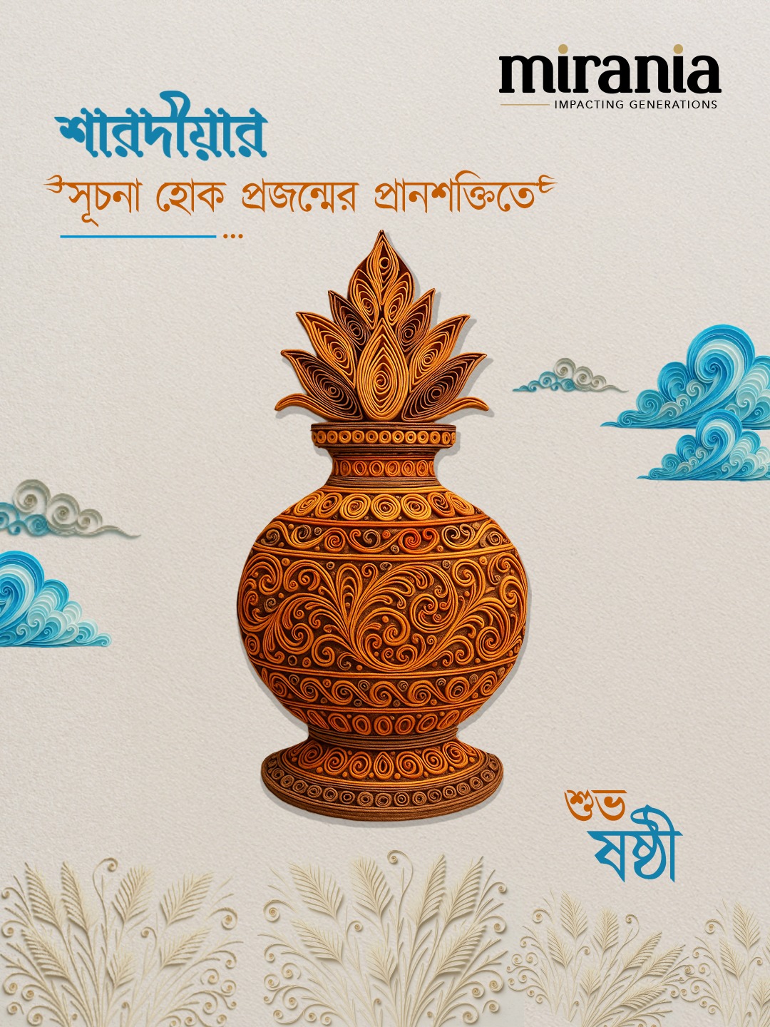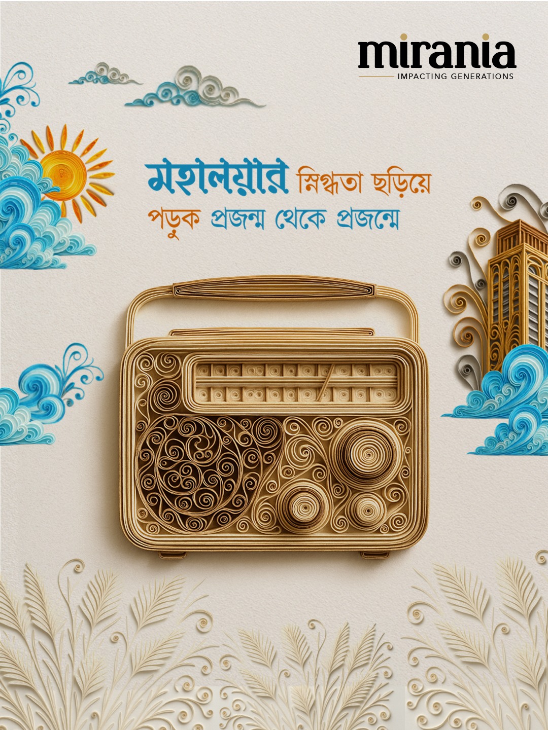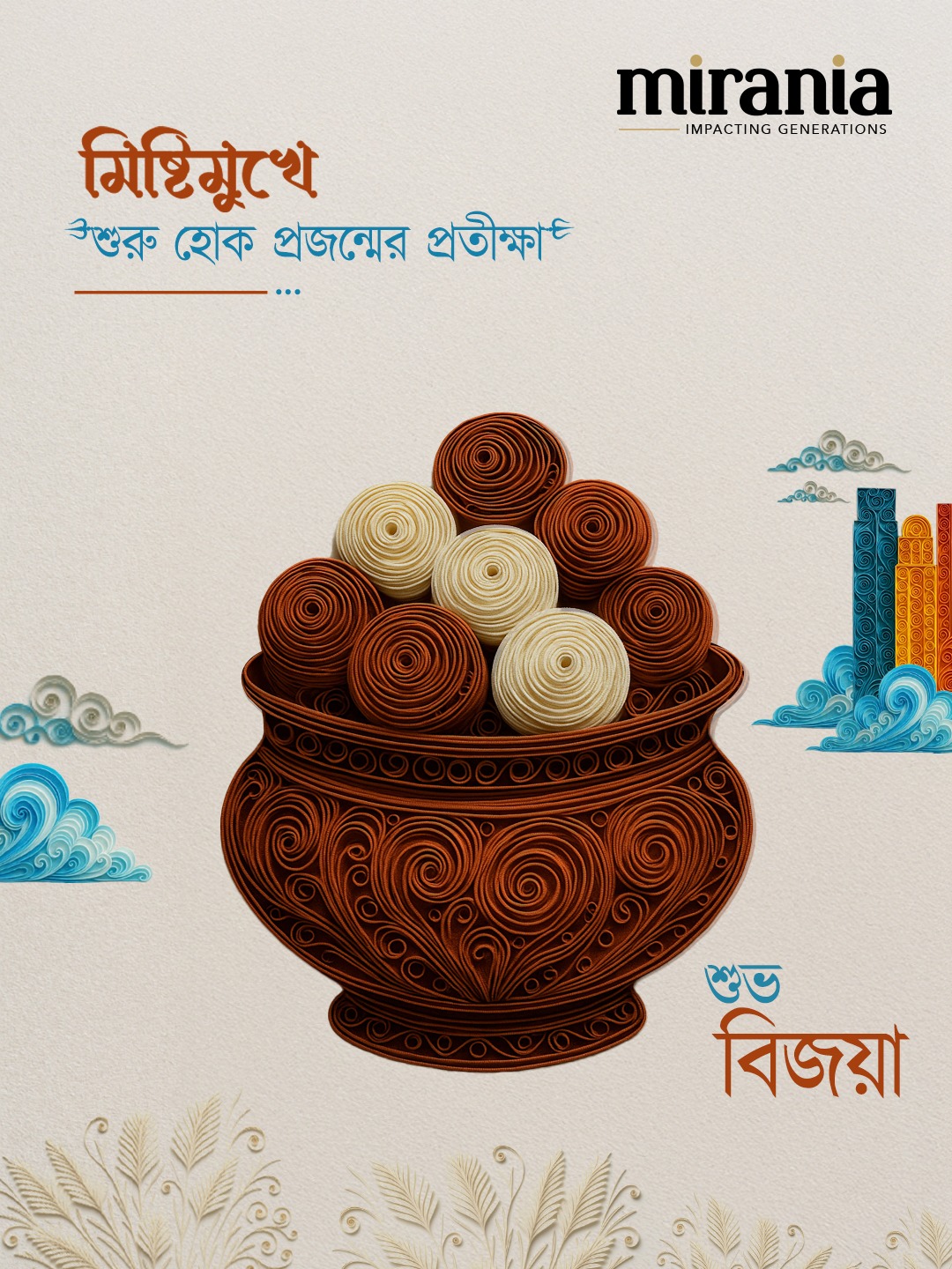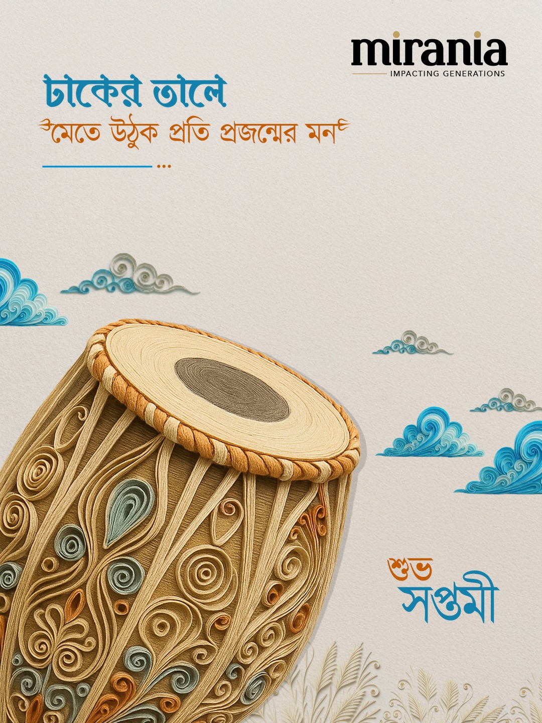 This festive season, Mirania celebrates the spirit of Durga Puja with art that blends tradition and creativity. Inspired by the intricate beauty of paper quilling, our campaign captures the essence of Shashti to Dashami — from the rhythm of the dhak to the serenity of the lotus. Each artwork reflects joy, devotion, and the timeless bond of togetherness.